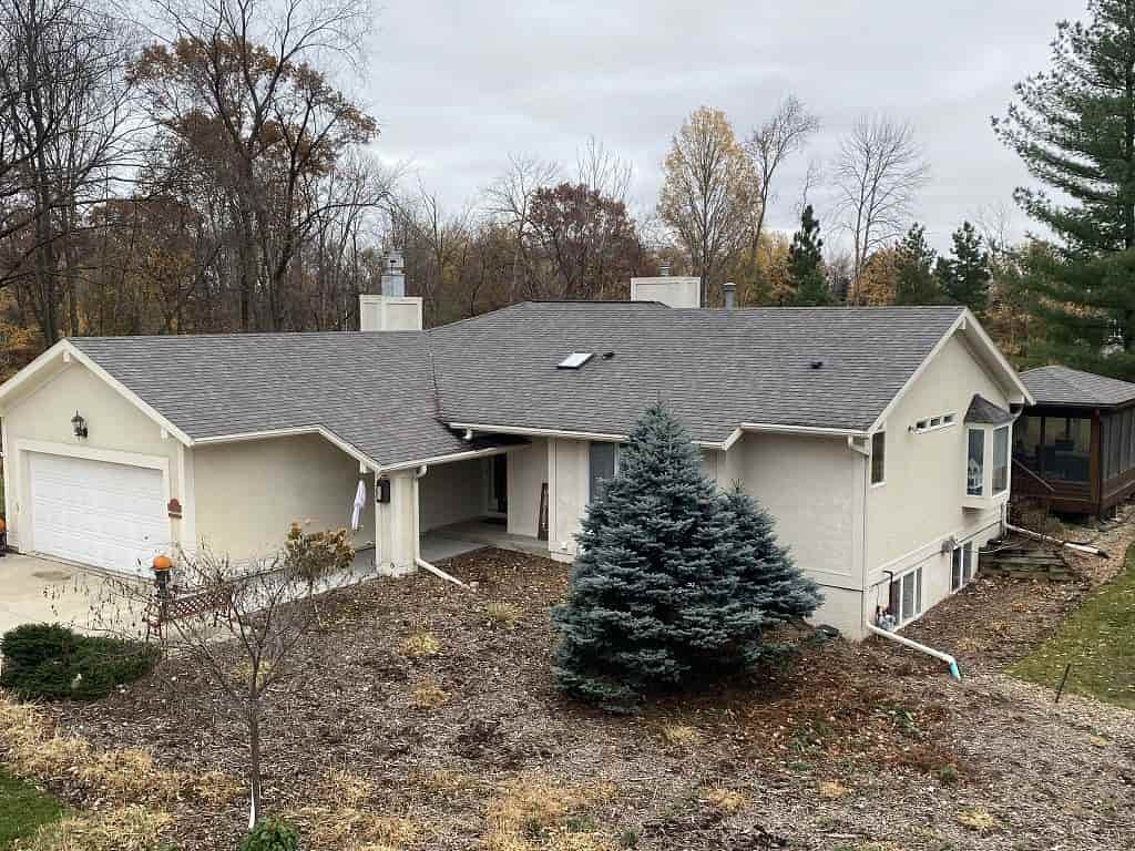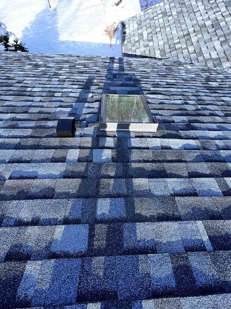 Upon our inspection, we found many areas where the hail had dislodged the granules on the shingles. The homeowners decided to file an insurance claim, and we made sure to work with the adjuster and insurance company to ensure the homeowner gets what they need. Once the construction day arrived, we started by covering all of the landscaping surrounding the home as well as the deck on the back of the house in order to prevent any damage from the debris. After his was done, we tore off the old, damaged shingles. We inspected the decking to ensure it was up to code and that there were no “mushy” spots that could cause future issues with leaks. After laying down Synthetic Underlayment, we put down a layer of Ice & Water Shield and also adding an additional layer over the front entryway for extra protection. This helps ensure that there are no leaks and protects against driving rain and high winds. The skylight on the home had also sustained damage, and so we were able to install a Velux FS skylight and ensured all the caulking and installation was up to code. Our final step was to Premium Owens Corning Duration Designer Shingles in the color “Pacific Wave”.
